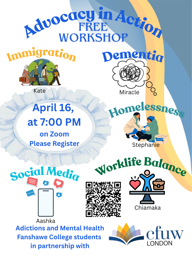 Join our Fanshawe College, Addictions and Mental Health students as they explore advocacy and awareness for the topics of Social Media Addiction, Student Immigration Changes, Immigrant Women's Work-Life Balance, Indigenous Women's Homelessness, and Dementia. Research findings and solutions to these issues will be discussed. Please join this improtant conversation with CFUW London and our student placement team.